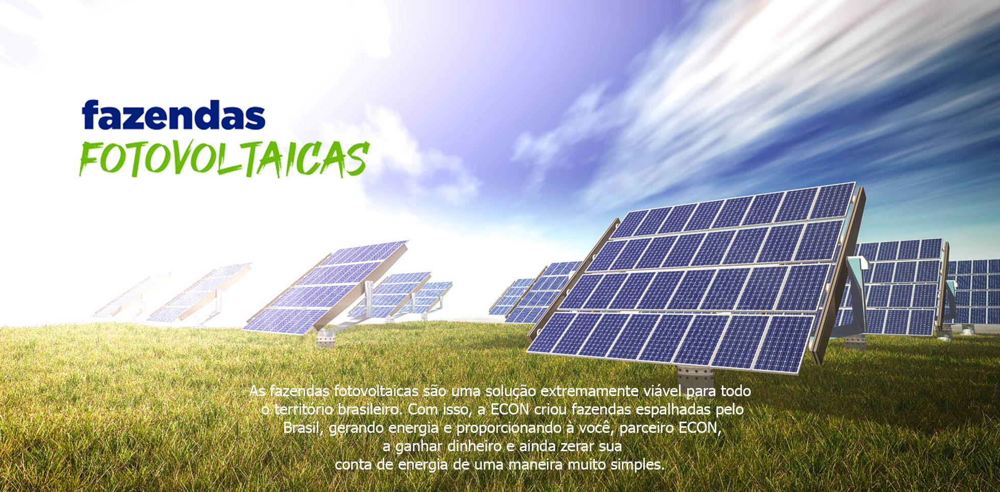 A ECON ENERGIA SOLAR é uma empresa de geração de energia solar compartilhada, que gera energia e vende para as empresas que tem um grande consumo como indústrias, redes de comércio, shopping centers, universidades, e outros negócios que tem um custo elevado com energia elétrica.