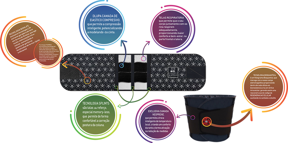 A Nossa cinta tem a capacidade de quebrar as moléculas de gordura, e assim o próprio organismo jogar fora conforme seu uso (ideal usá-la de 2 a 4hrs por dia), além de corrigir a postura e aliviar dores na coluna através da sua ação de raios infra-vermelhos longo.
